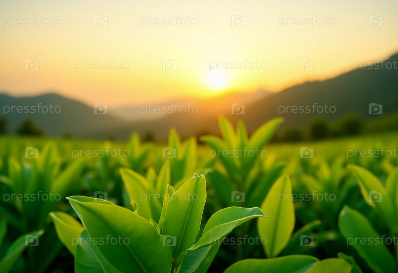 Восход солнца бросает теплый золотой оттенок на растянутые чайные плантации с ярко-зелеными листьями, достигающими неба