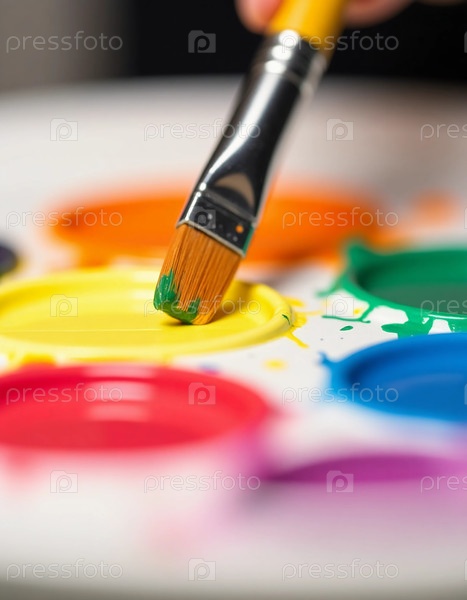 В шумной художественной студии квалифицированная рука умело ориентируется по цветовой палитре, используя яркую кисть для рисования богатыми желтыми и зелеными цветами, выражающими творчество и страсть