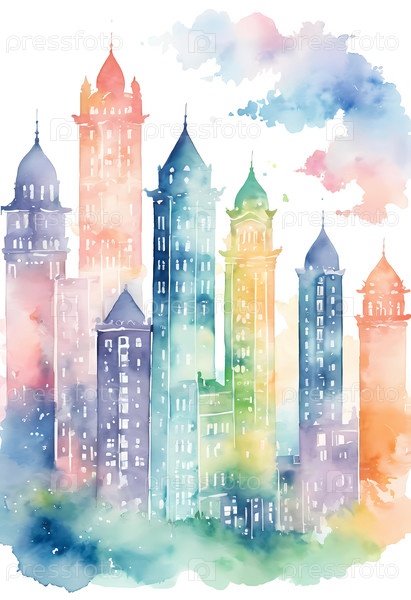 Яркое акварельное изображение китайских архитектурных чудес в шумном городском ландшафте на закате генеративного ИИ