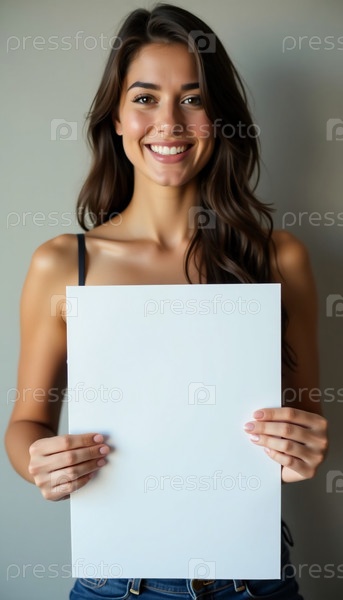 Веселая молодая женщина стоит в привлекательном пространстве, держа перед собой чистую табличку.Атмосфера теплая и яркая, приглашающая к творчеству и исследованию идей генеративного ИИ