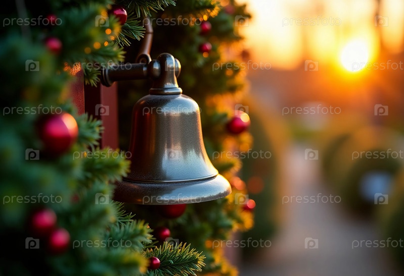 От двери висит красиво детализированный колокол, украшенный яркой праздничной зеленью и красными ювелирными изделиями, освещенные теплым светом заката солнца, создавая праздничную атмосферу генеративного ИИ