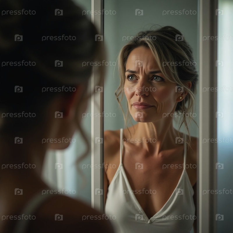 Седая женщина стоит перед зеркалом, ее вдумчивое выражение раскрывает глубокие размышления и эмоции