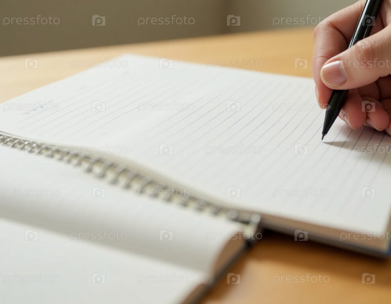 Рука держит ручку на пустой странице блокнота, вызывая мысли и вдохновение. спокойное пространство приглашает к творчеству и размышлениям, готово для новых идей