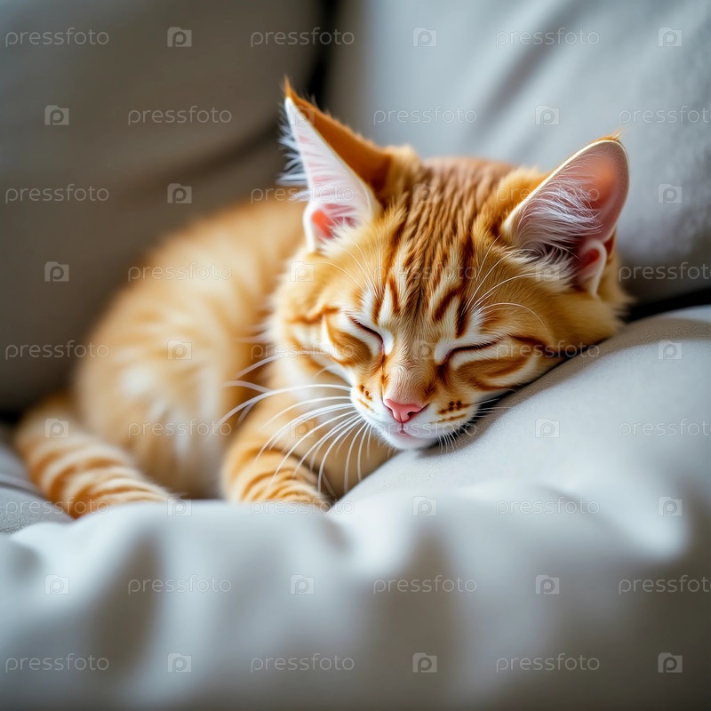 Плодородная красная кошка удобно лежит на мягком диване с закрытыми глазами и расслабленной, обнимая спокойствие, когда солнечный свет мягко фильтруется, отбрасывая теплое свечение в комнате