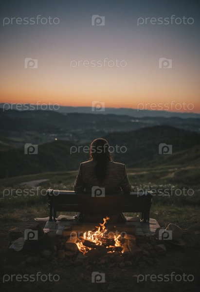 Мужчина спокойно сидит на скамейке рядом с мягким костром, глядя в яркое сумеречное небо, когда солнце садится за далекие горы, отмечая священную субботу