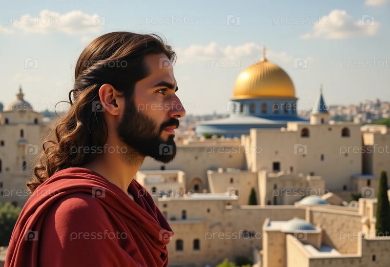 Вдумчивая фигура, напоминающая Иисуса Христа, смотрит на древний город Иерусалим, где золотые куполы и историческая архитектура рассказывают истории веры и традиции