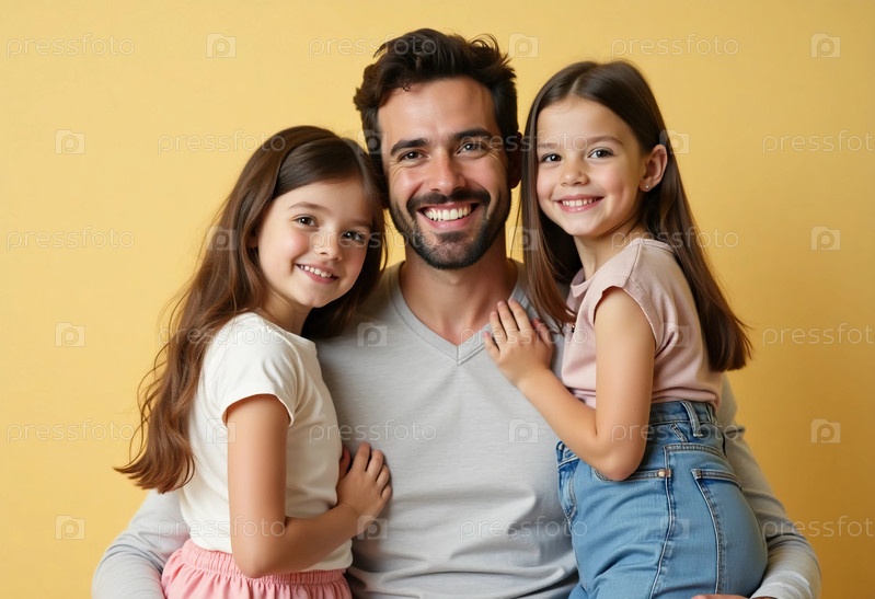 Веселого отца обнимают две его дочери, которые ярко улыбаются и демонстрируют свою игривую личность