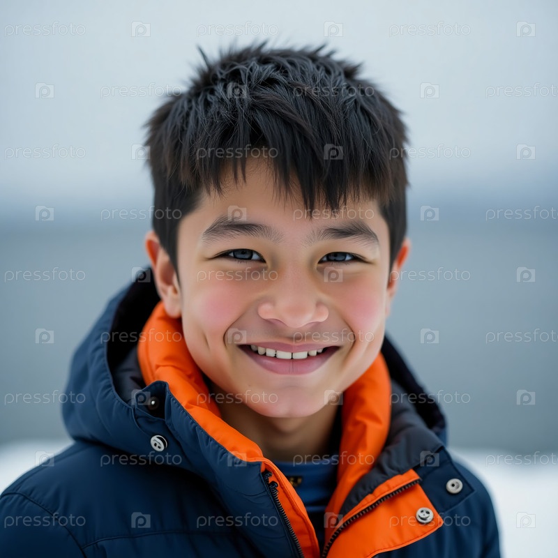 Молодой мальчик с Аляски, излучающий радость, стоит в своей зимней куртке на спокойном снежном фоне