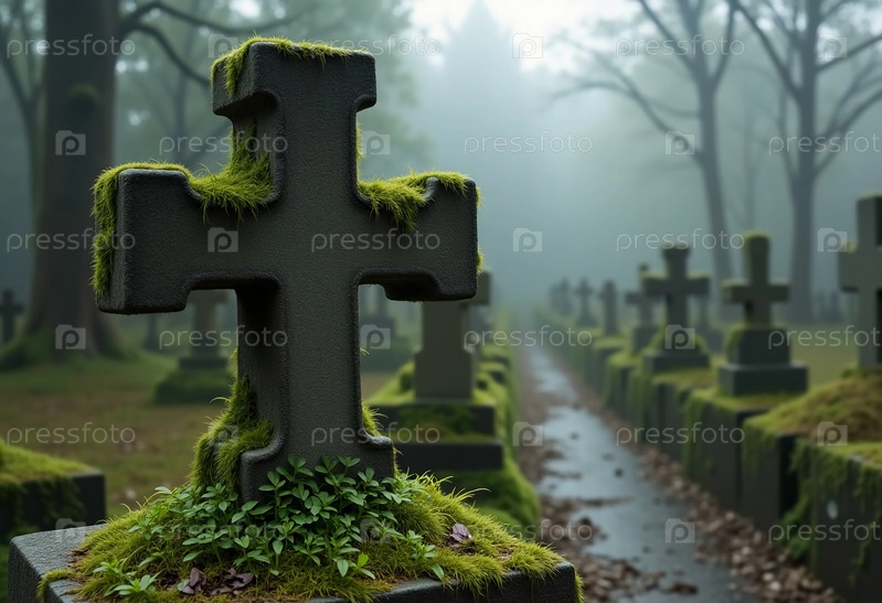 Забытое кладбище покрыто густым, эфирным туманом с мохом, смягчающим края выветрившихся крестовых надгробий Generative AI