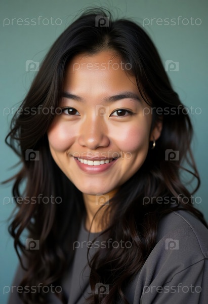 Мудрая женщина с Аляски тепло улыбается, ее длинные темные волосы обрамляют лицо на мягком голубом фоне