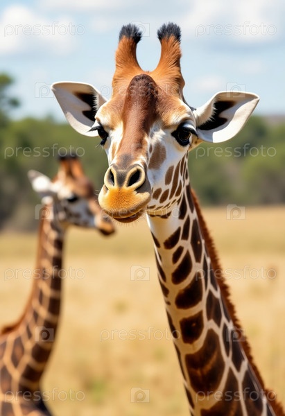 Два элегантных жирафа стоят на африканской саване, их длинные шеи достигают голубого неба, в то время как один любопытно смотрит издалека среди золотистой травы