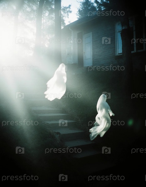 Две призрачные фигуры висят над ступеньками в темном лесу возле старого дома, их полупрозрачные формы мерцают, когда лучи света проникают через деревья, создавая жуткую атмосферу