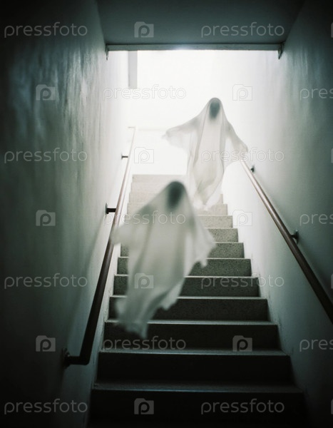 Странные призрачные формы плавают по лестнице в слабо освещенном коридоре, захватывая дух Хэллоуина с жуткой атмосферой и преследующим присутствием генеративного ИИ