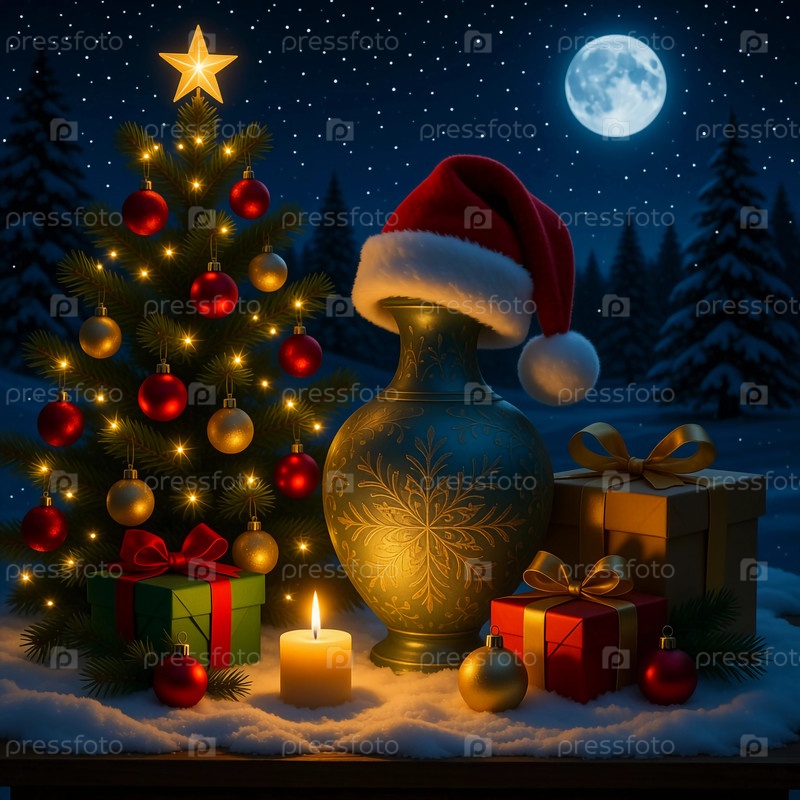 Красиво украшенная рождественская елка с красочными декорациями стоит рядом с элегантной вазой и подарками Generative AI на праздники