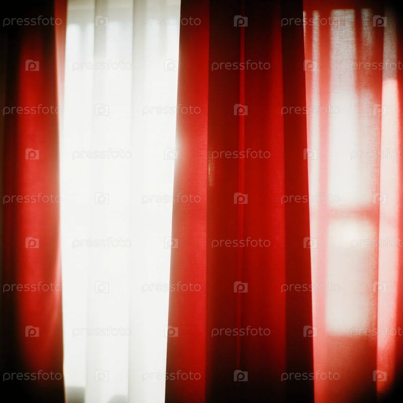 Ярко-красные шторы висят рядом с белыми панелями в теплой комнате.Дневный свет аккуратно фильтруется через ткань, создавая нежную атмосферу