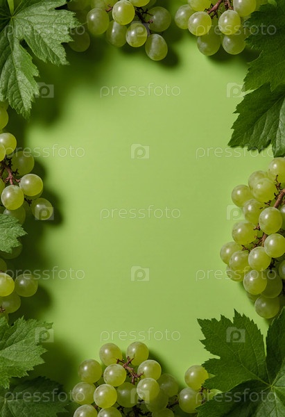 Кластеры свежих зеленых виноградных лоз аккуратно расположены на ярко-зеленом фоне, окруженные зелёными листьями, которые добавляют естественный оттенок в состав Generative AI