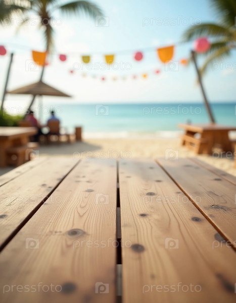 Теплый солнечный свет купает деревянный стол перед безмятежным пляжем, где красочные декорации мягко качаются на ветре и океан блестит привлекательно за пределами генеративного ИИ