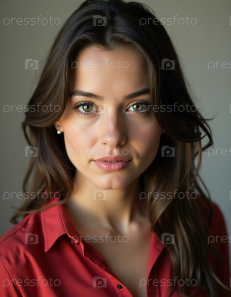 В мягко освещенной поместной среде молодая женщина с длинными, текучими волосами и теплыми тонами кожи выглядит уверенно, ее выразительные глаза отражают чувство спокойствия и красоты