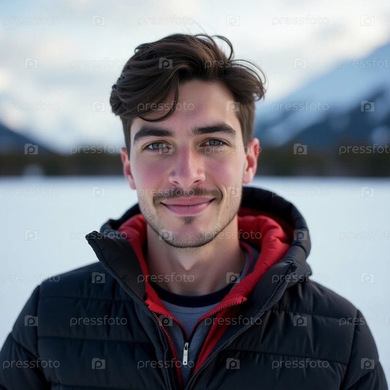 Близкий план молодого коренного жителя Аляски, излучающего радость и теплоту в волшебной зимней стране чудес, наполненной искрящимся снегом и величественными горными вершинами под ярким небом
