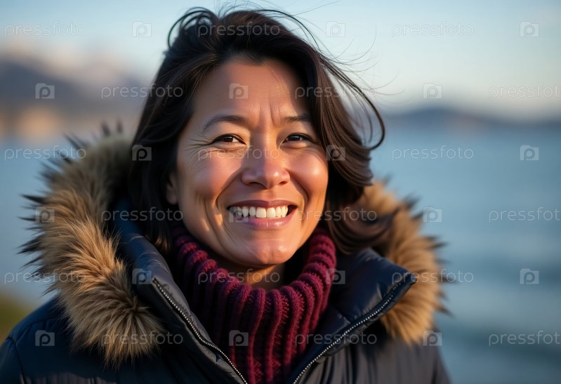 Веселая женщина-коренной жительница Аляски стоит у берега, завернутая в уютное пальто с генерирующей искусственным интеллектом меховой капюшоном