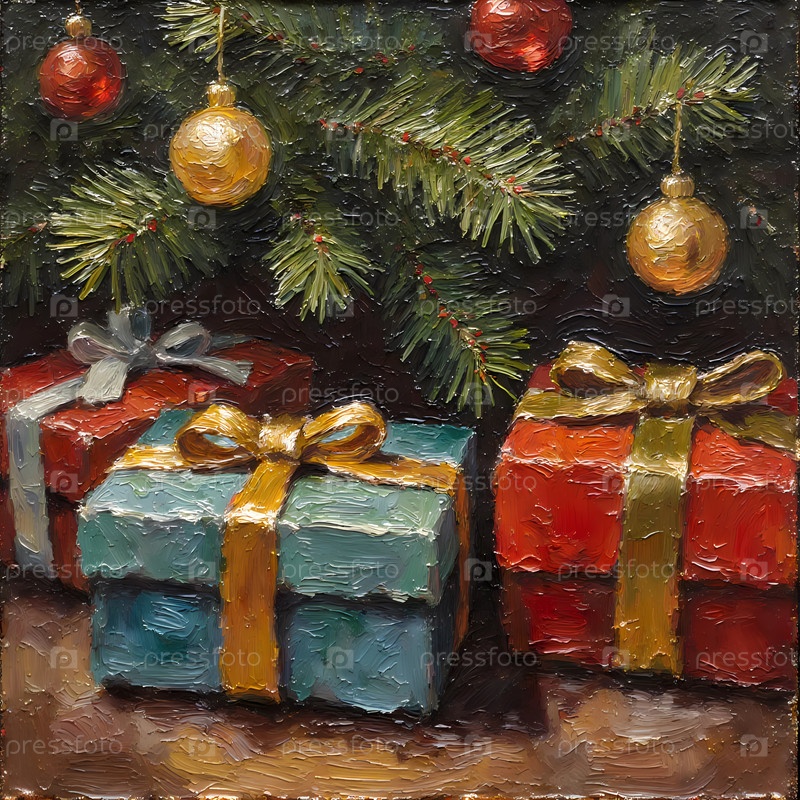 Красочные рождественские подарки в красно-синем цвете с блестящими луками сидят под декорированной елкой, украшенной золотыми ювелирными изделиями.Сцена отражает тепло и волнение праздничного сезона генеративного ИИ