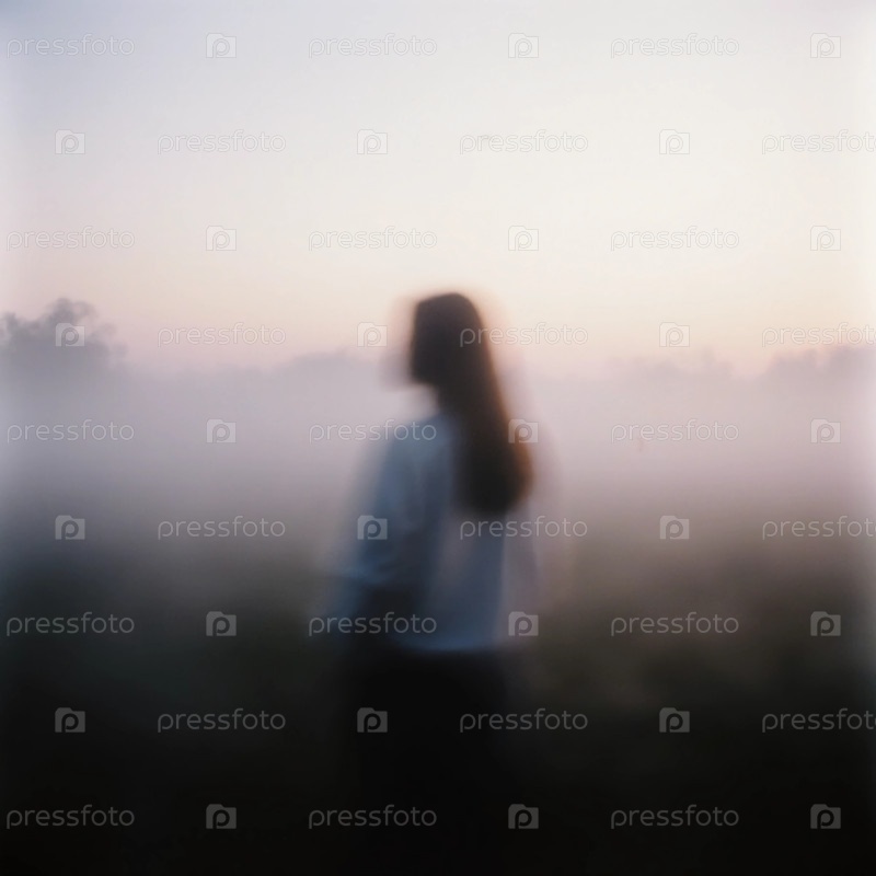 Девушка стоит на туманном поле, ее силуэт едва виден, поскольку мягкий утренний свет фильтрует через дым
