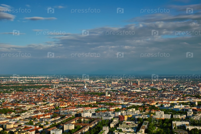 Вид из воздуха на центр Мюнхена с Олимпиатурма (Олимпийской башни).Мюнхен, Бавария, Германия