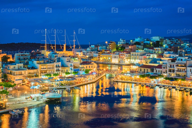 Красивый город Агиос-Николаос ночью.Ласити регион на острове Крит, Греция