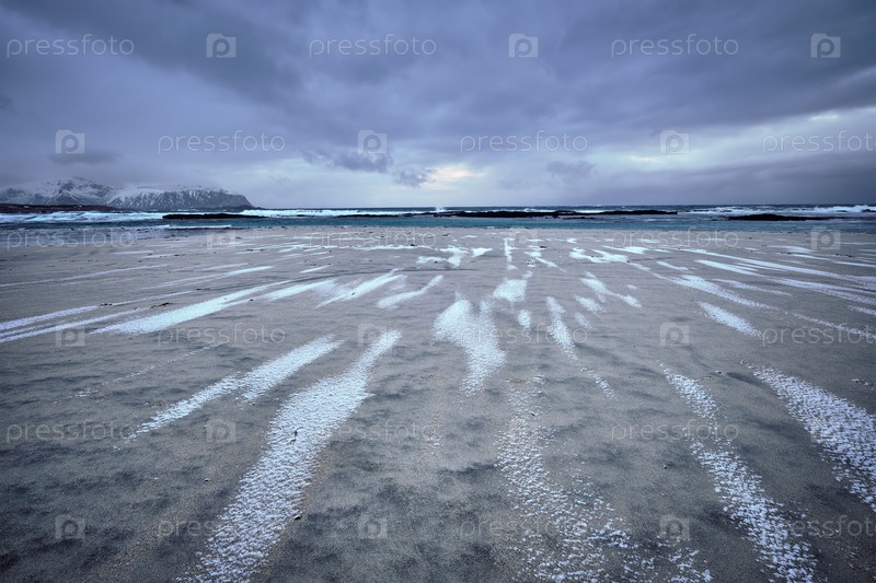 Каменистое побережье фьорда Норвежского моря зимой.Пляж Скагсанден, Остров Лофотен, Норвегия