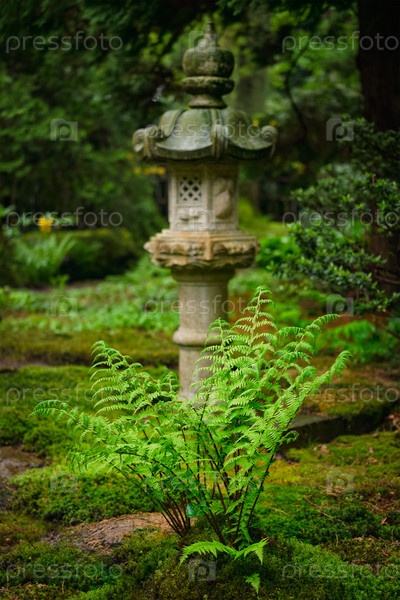 Зеленый папоротник и фонарь в японском саду, парк Клингендейл, Гаага, Нидерланды