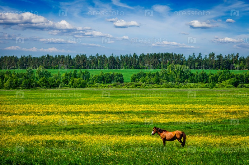Зеленый пейзаж с лошадью