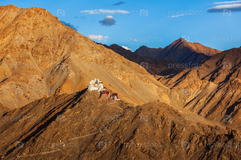 Руины форта Цемо (Победа), Намгиял-Цемо Гомпа на скале холма Намгьяла и Гималаев.Лех, Ладакх, Джамму и Кашмир, Индия