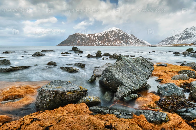 Скалистое побережье фьорда Норвежского моря зимой со снегом