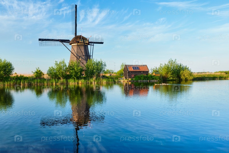 Голландская деревня с ветряными мельницами на знаменитом туристическом объекте Kinderdijk в Нидерландах