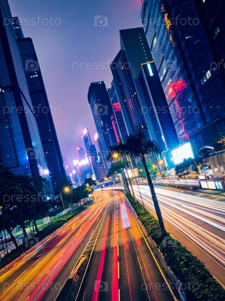 Уличное движение в Гонконге ночью.Офисные небоскребы и оживленный трафик на шоссе с размытыми пассажирскими дорожками.Гонконг, Китай