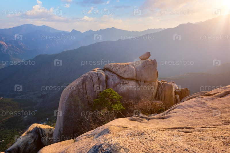 Вид на скалы и каменные образования с вершины Ульсанбави при закате солнца