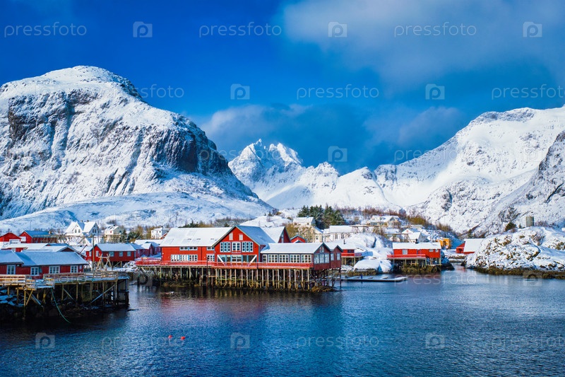 Традиционная рыбацкая деревня А на Лофотенских островах, Норвегия с домами из красного руербу