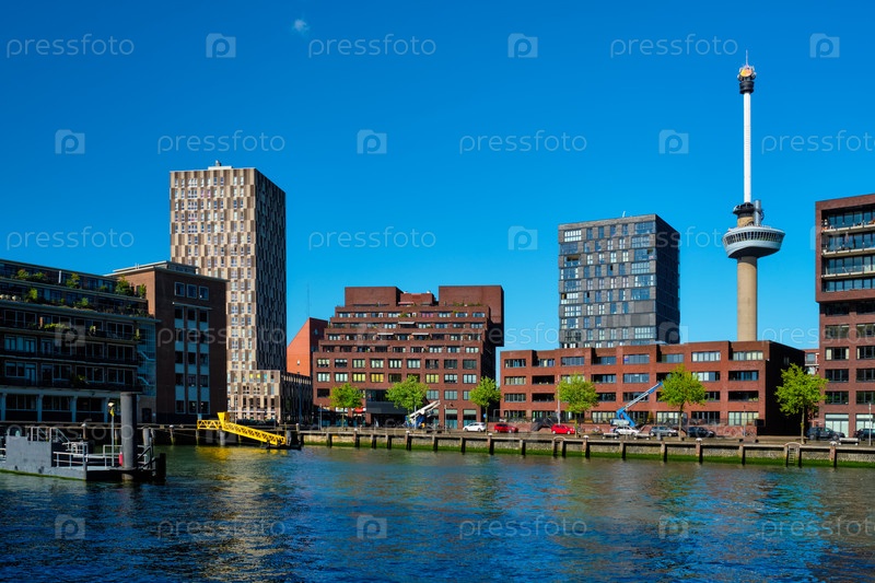 Городской пейзаж Роттердама с смотровой башней Euromast и рекой Nieuwe Maas