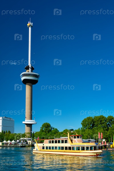 Городской пейзаж Роттердама с смотровой башней Euromast и туристической лодкой на реке Нив Маас