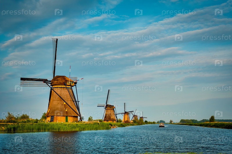 Голландский сельский пейзаж с ветряными мельницами на знаменитом туристическом месте Kinderdijk в Нидерландах при закате солнца с драматическим небом