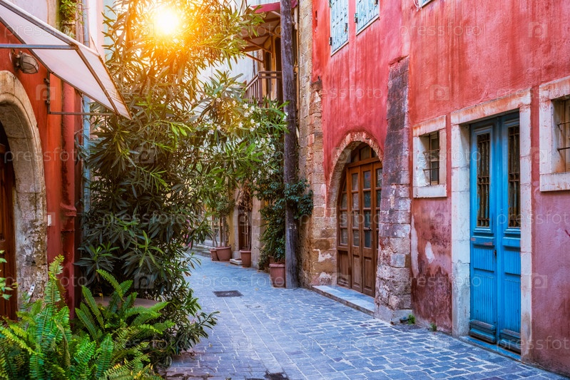 Живописные улицы Ханьи Венецианский город с уютными старыми домами.Утром в деревне Ханья греческий Чанака, остров Крит, Греция