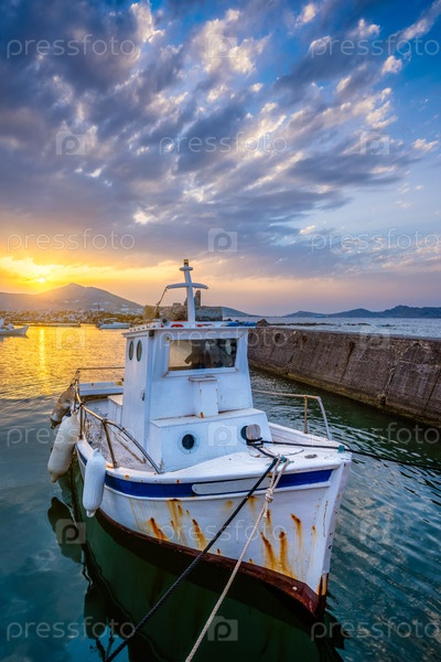 Рыболовная лодка в порту Наоузы при закате солнца. остров Парос, Греция