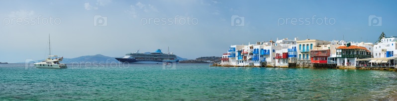 Маленькая Венеция в Хоре Миконос с яхтой и круизным судном.Остров Миконос, Греция