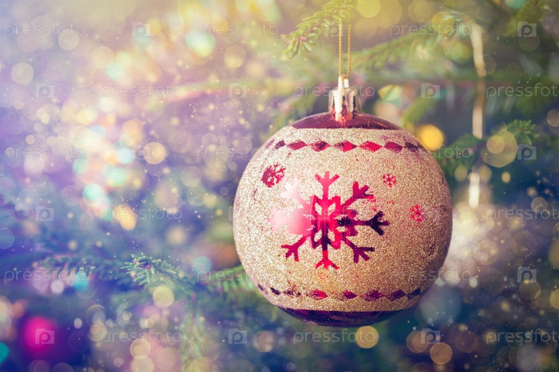 Рождественский фон - украшение рождественской елки на декорированной рождественской елке с размытыми туманными огнями боке и кописпалом