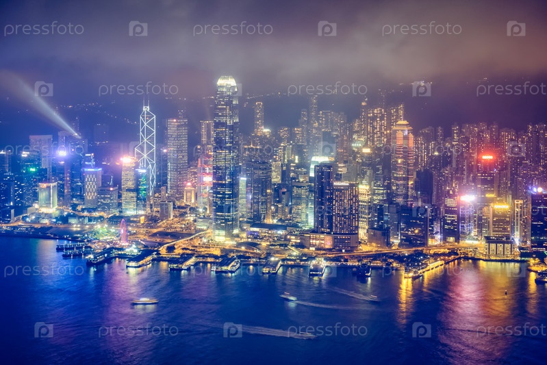 Вид с воздуха освещенного горизонтального ландшафта Гонконга небоскребов в центре города над гаванью Виктория вечером