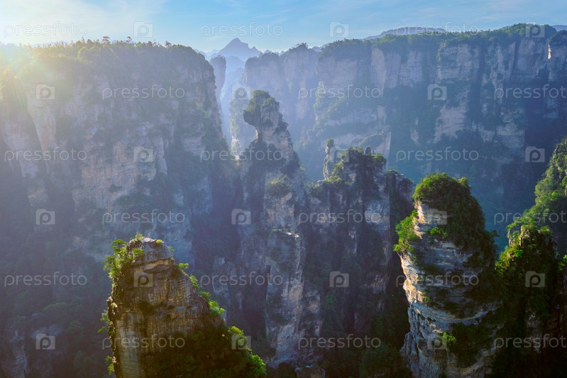 Известная туристическая достопримечательность Китая - каменные столбы скальных гор Чжанцзянджи при закате солнца в Улингюане, провинция Хунань, Китай