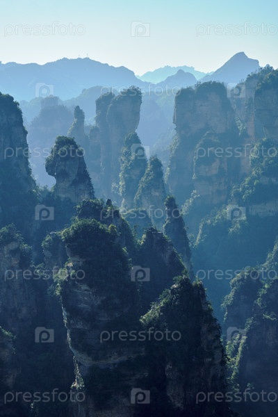 Известная туристическая достопримечательность Китая - каменные столбы скальных гор Чжанцзянджи при закате солнца в Улингюане, провинция Хунань, Китай