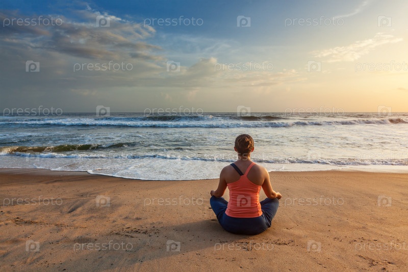 Женщина, занимающаяся йогой - медитируйте и расслабляйтесь в Padmasana Lotus asana с наружным подбородком на тропическом пляже при закате солнца