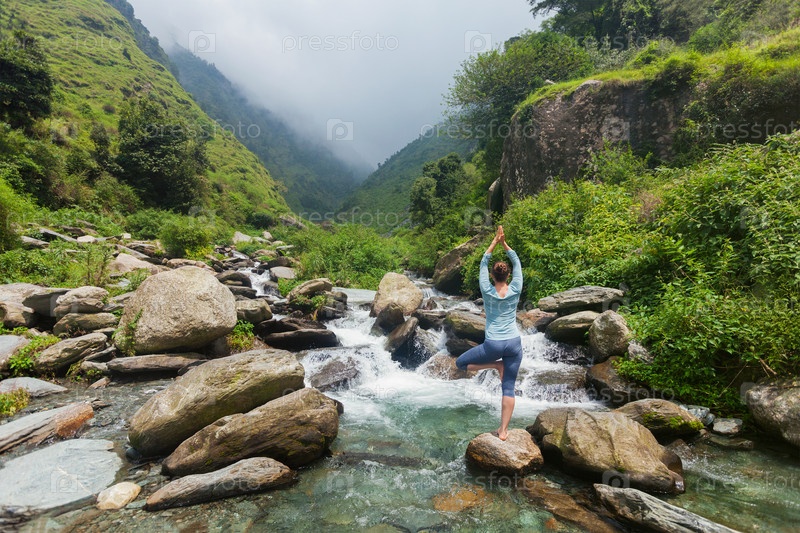 Женщина в асане йоги Vrikshasana позирует у водопада на открытом воздухе