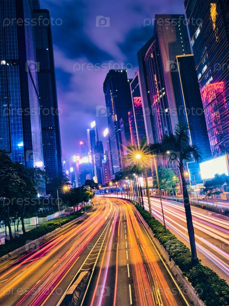 Уличное движение в Гонконге ночью.Офисные небоскребы и оживленный трафик на шоссе с размытыми пассажирскими дорожками.Гонконг, Китай